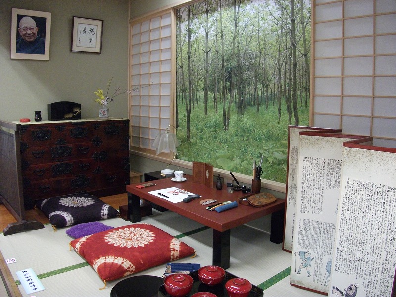 寂聴記念館は庁舎の2階に作られています。徳島と同じく、寂聴さんの書いた本がずらりと展示されているほか、天台寺の庫裏(お寺の住職が住む建物)にあった寂聴さんの書斎がそのまま移設されています。