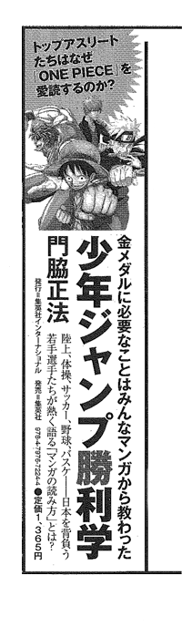 朝日新聞に『少年ジャンプ勝利学』2012年6月27日By admin 少年ジャンプ勝利学本日の朝日新聞・朝刊に弊社新刊『少年ジャンプ勝利学』の宣伝が載りました! また、コミック・ナタリーさんにも『少年ジャンプ勝利学』の紹介が載りました!投稿ナビゲーション大好評☆町山智浩さんのWEB連載深読みシネ・ガイド「なぜ『フォレスト・ガンプ』は怖いのか」第6回目、本日アップしました。『バクマン。』最終巻!