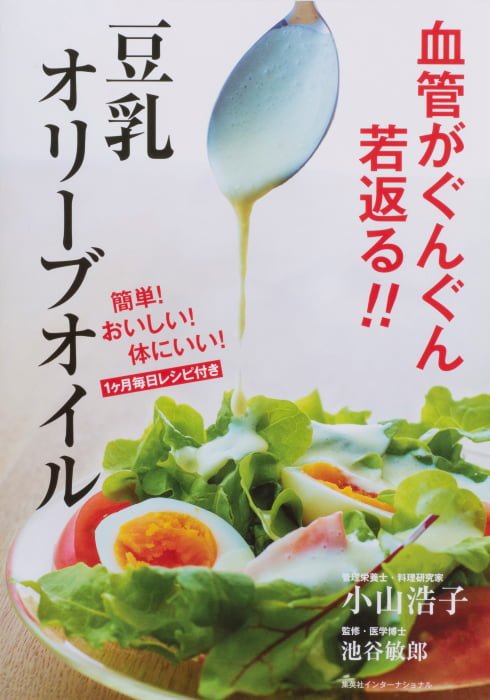 乳和食など、テレビでおなじみの料理研究家、小山浩子氏が提案する新調味料「豆乳オリーブオイル」は、続けることで、血管を若返らせ、年齢と共に増えてくる、血管事故を防ぐ働きが期待されます。
